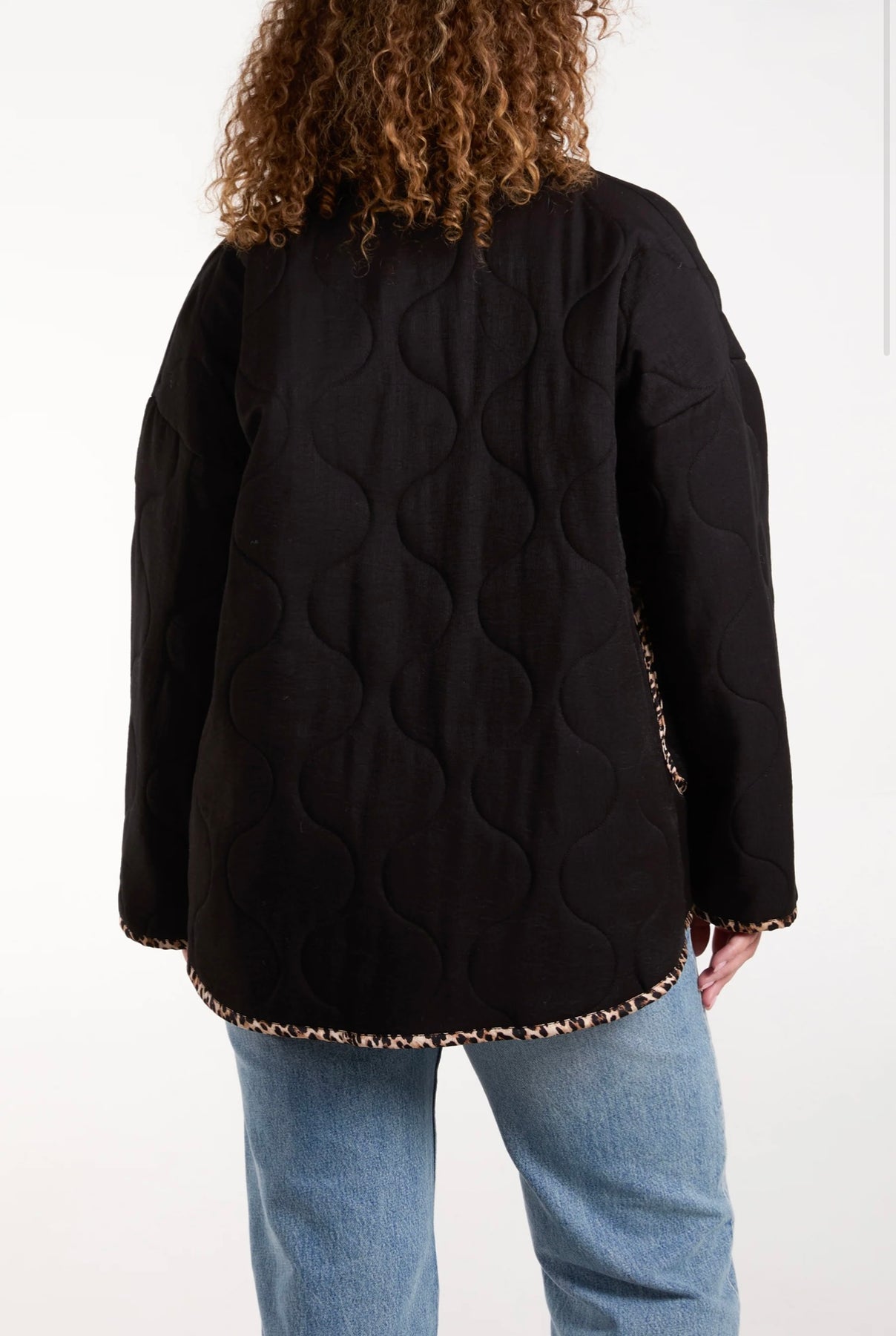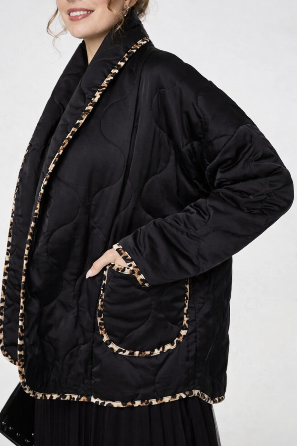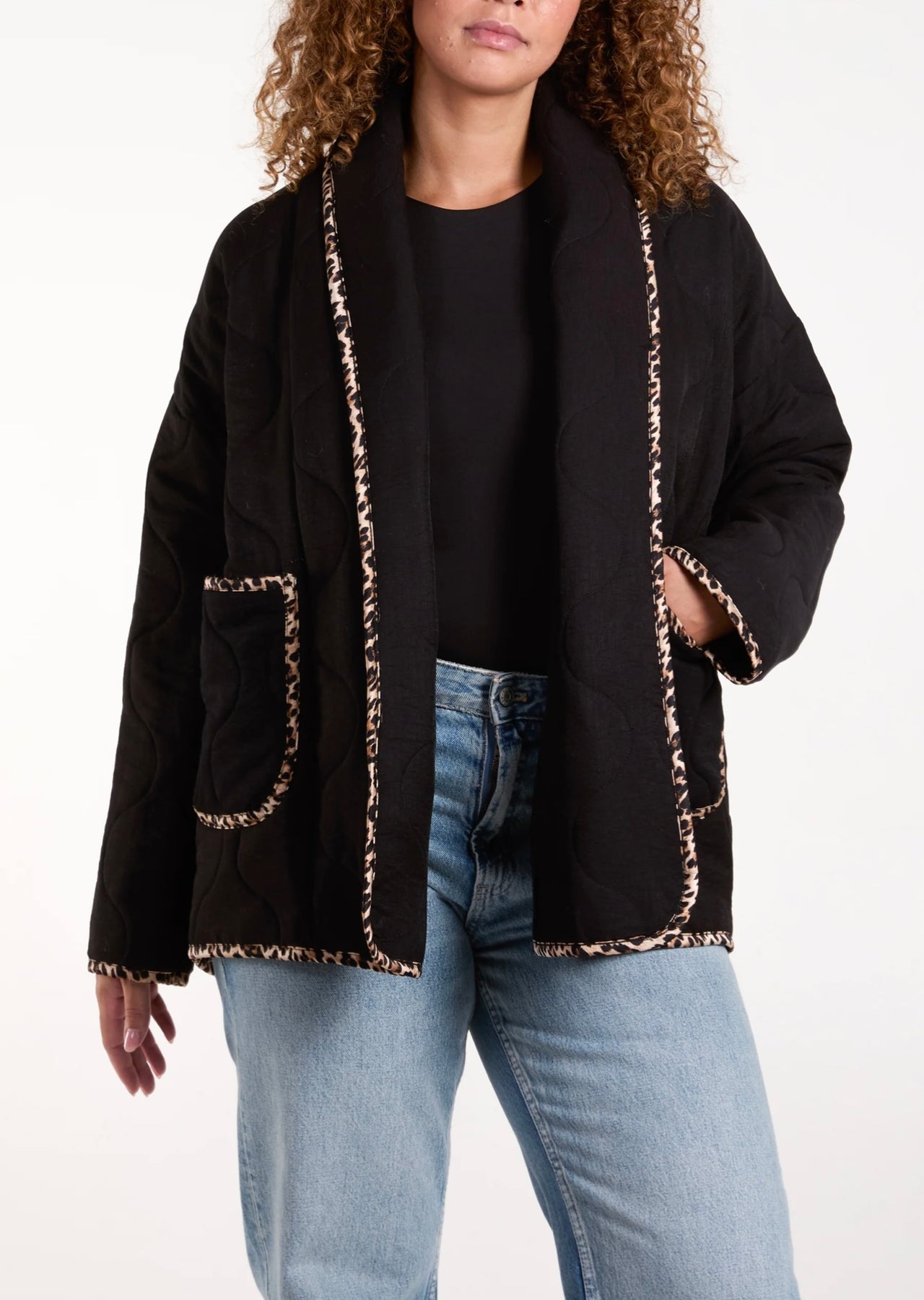 Nera black quilted jacket for women with leopard trim, relaxed fit and modern everyday style.