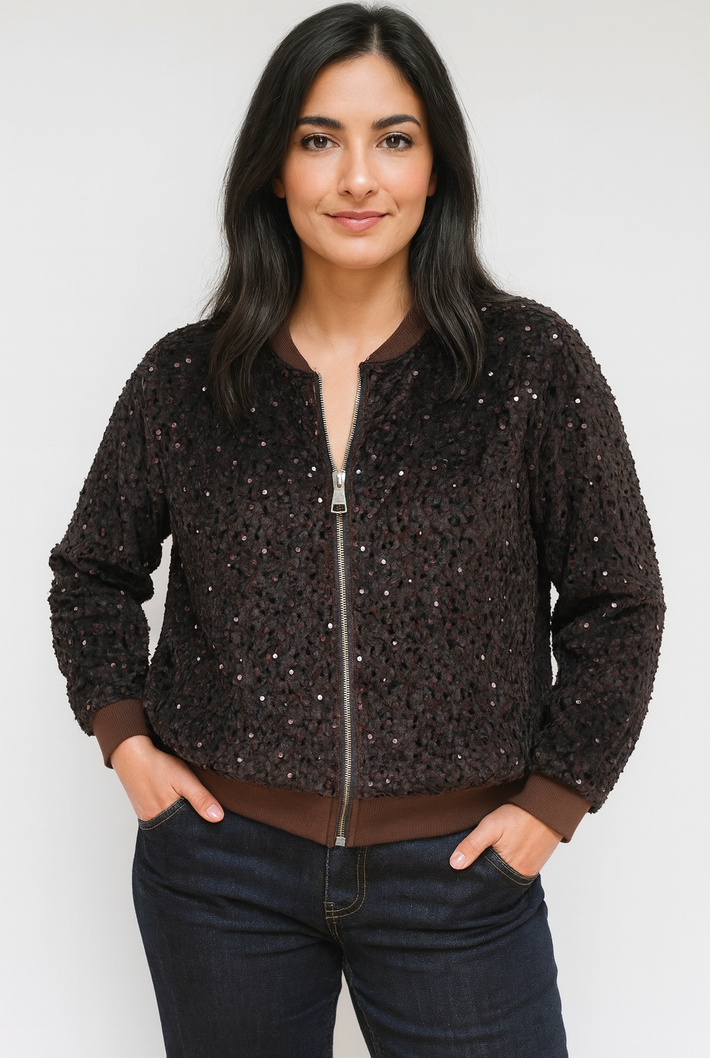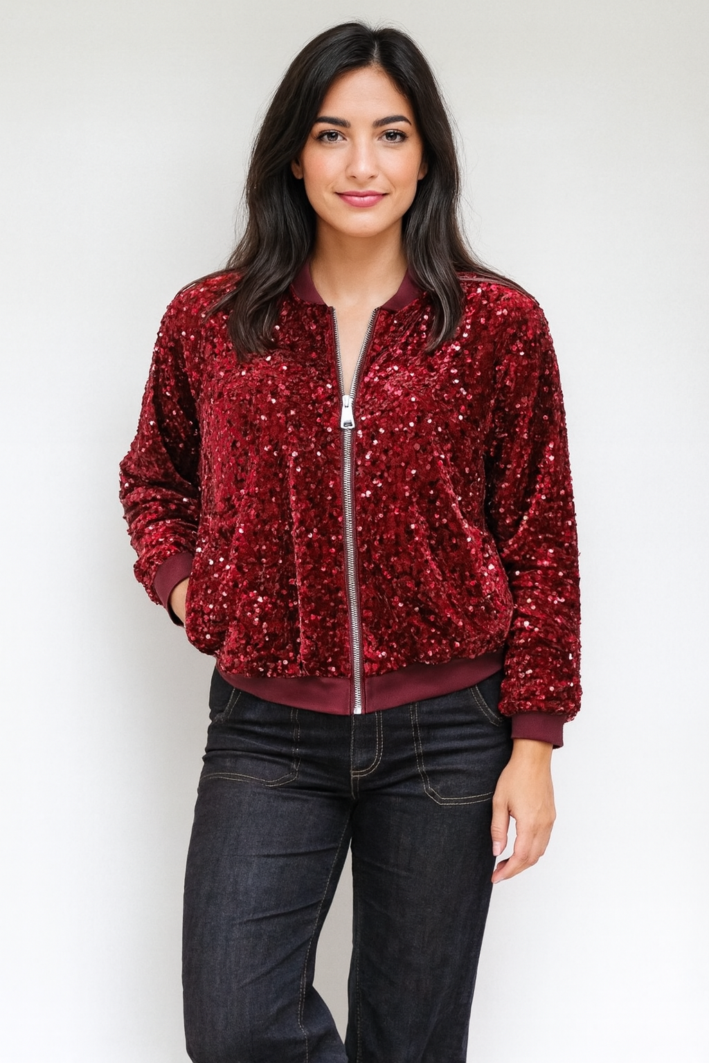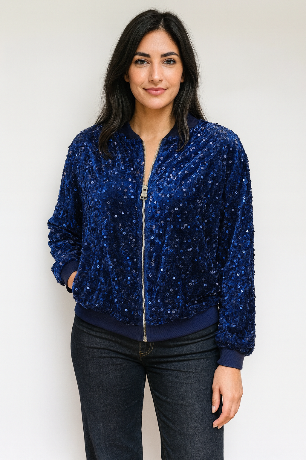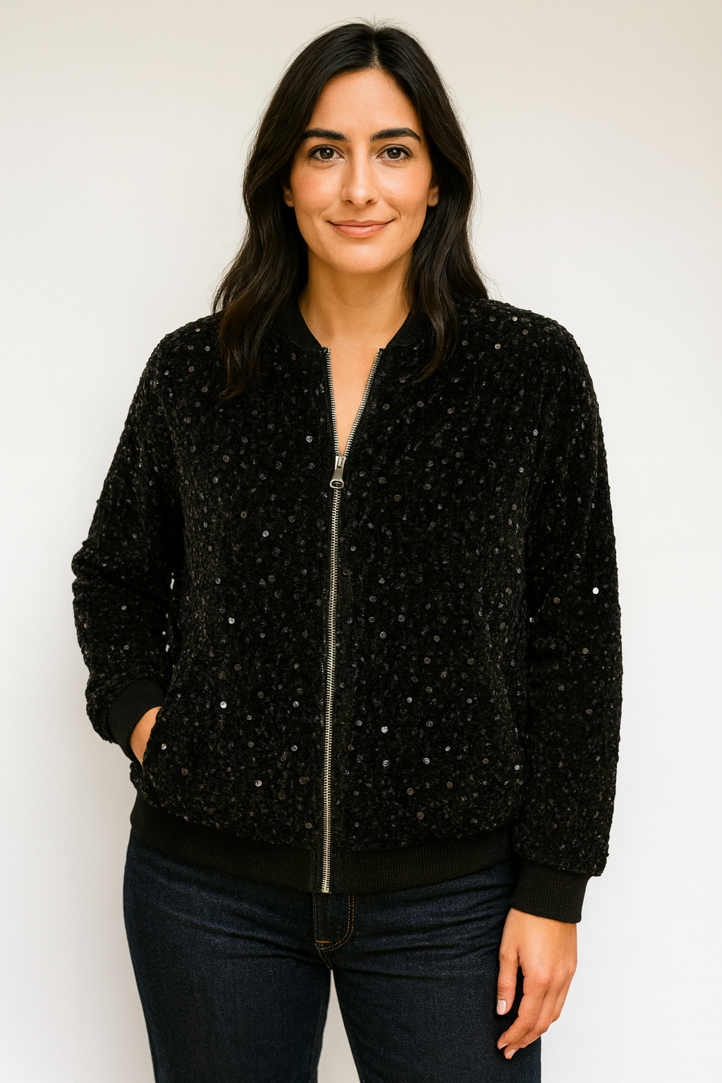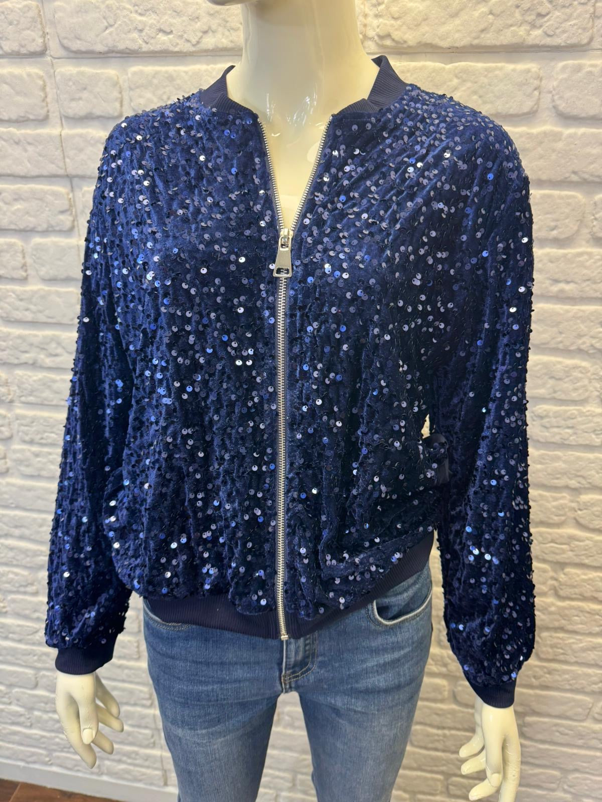 Bring instant magic and shine to your wardrobe with Magia, our standout sequin bomber jacket designed to elevate every look with effortless glamour. The relaxed fit, full soft lining and ribbed trim make it comfortable to wear while the sequins catch the light beautifully, giving you a chic, polished style from day to night. Wear it open for a relaxed feel or zipped for a sleeker silhouette. Magia looks fabulous with your favourite Fleur or Conny jeans, and transforms into a smart, elegant outfit when styled with our Marilyn tulle skirt — perfect for evenings out, festive occasions or any moment you want to shine. A true statement piece, Magia brings modern glamour, versatility and unmistakable Aria style to every outfit.
