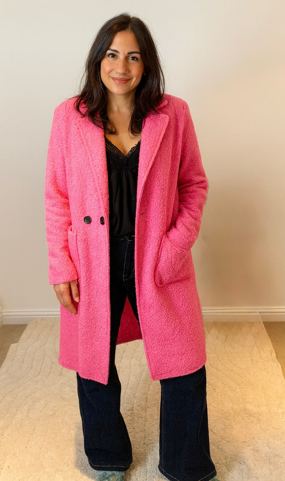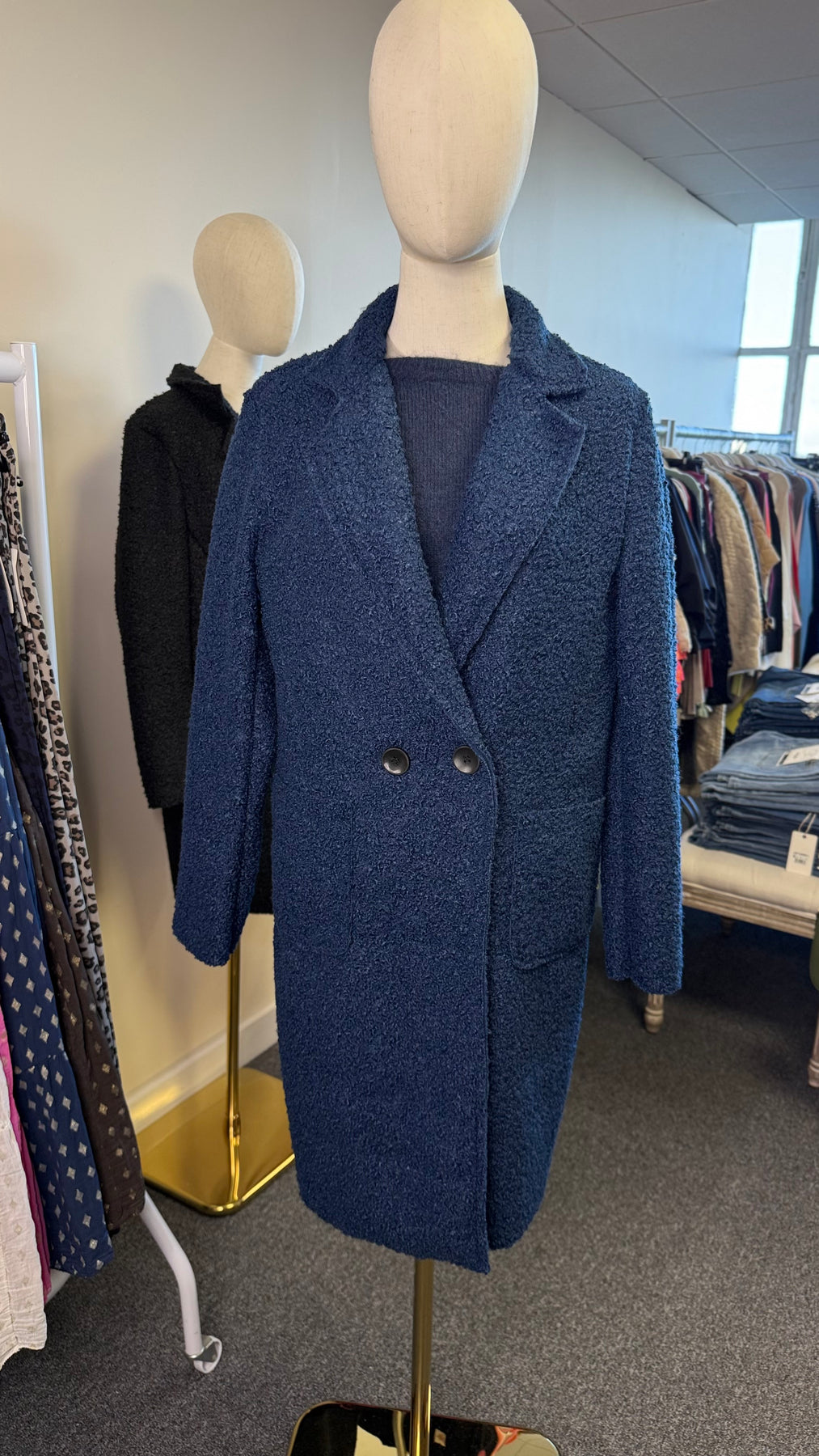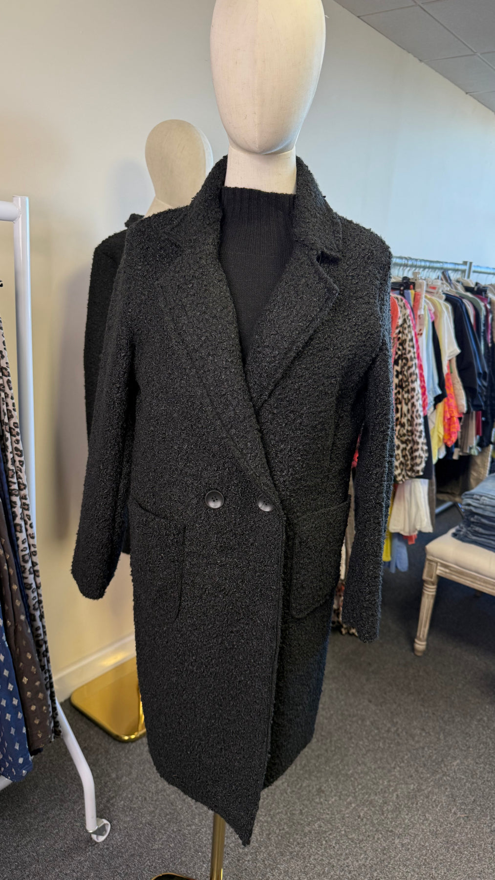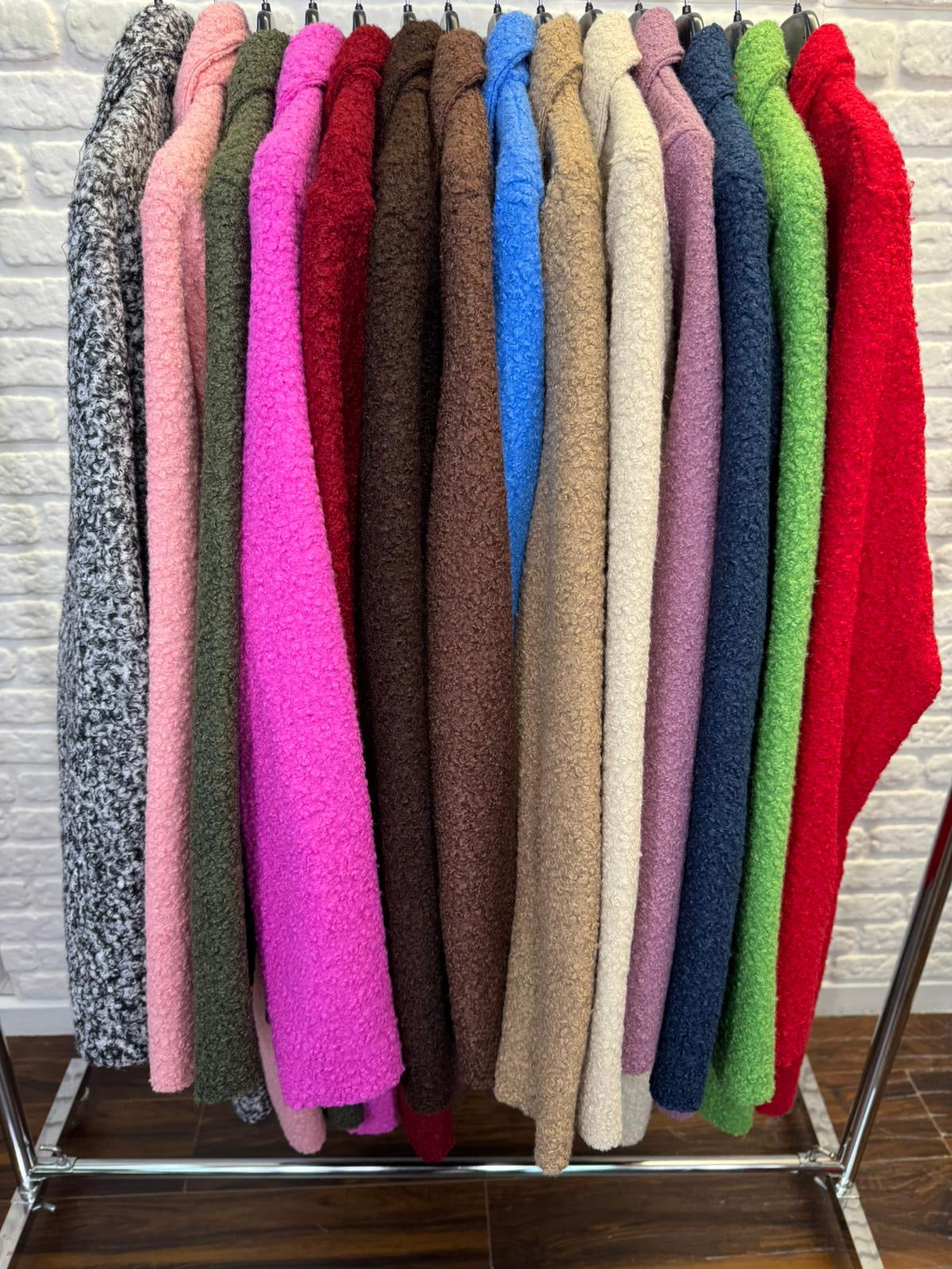 Wrap yourself in pure comfort with the Teddy Bouclé Italian Coatigan – Abbraccio, a beautifully soft unlined Italian coatigan that offers the ideal balance between medium-lightweight feel and impressive warmth. The plush teddy bouclé textured knit holds in heat naturally, and because it’s unlined, you can easily layer it over all your winter jumpers—making it much warmer than it looks. Designed in a chic longline silhouette, it features elegant notched lapels, a double-button front, and practical deep pockets, giving you a polished yet relaxed look perfect for everyday styling. Whether you’re heading to work, the school run or a weekend outing, “Abbraccio” wraps you in that cosy, Italian-inspired hug that its name promises.