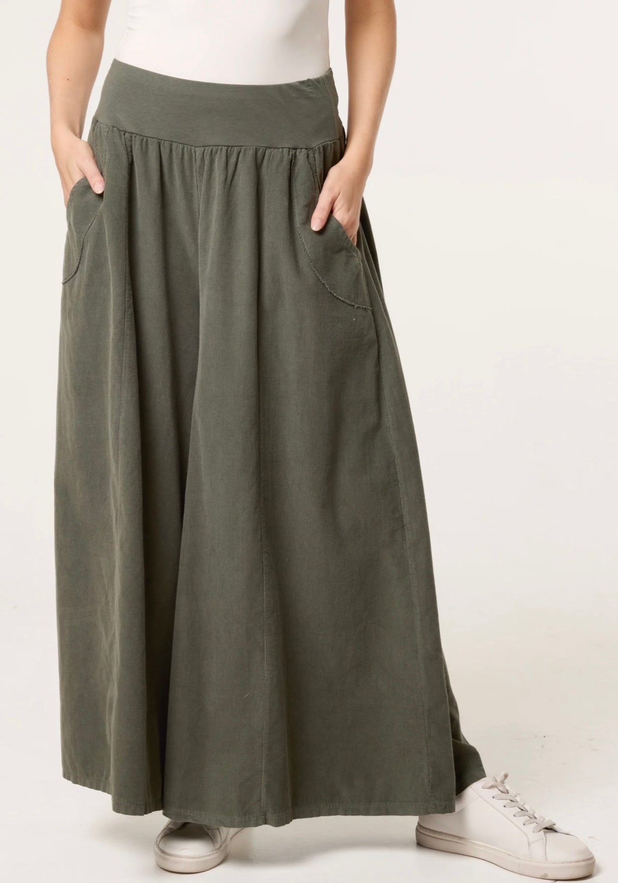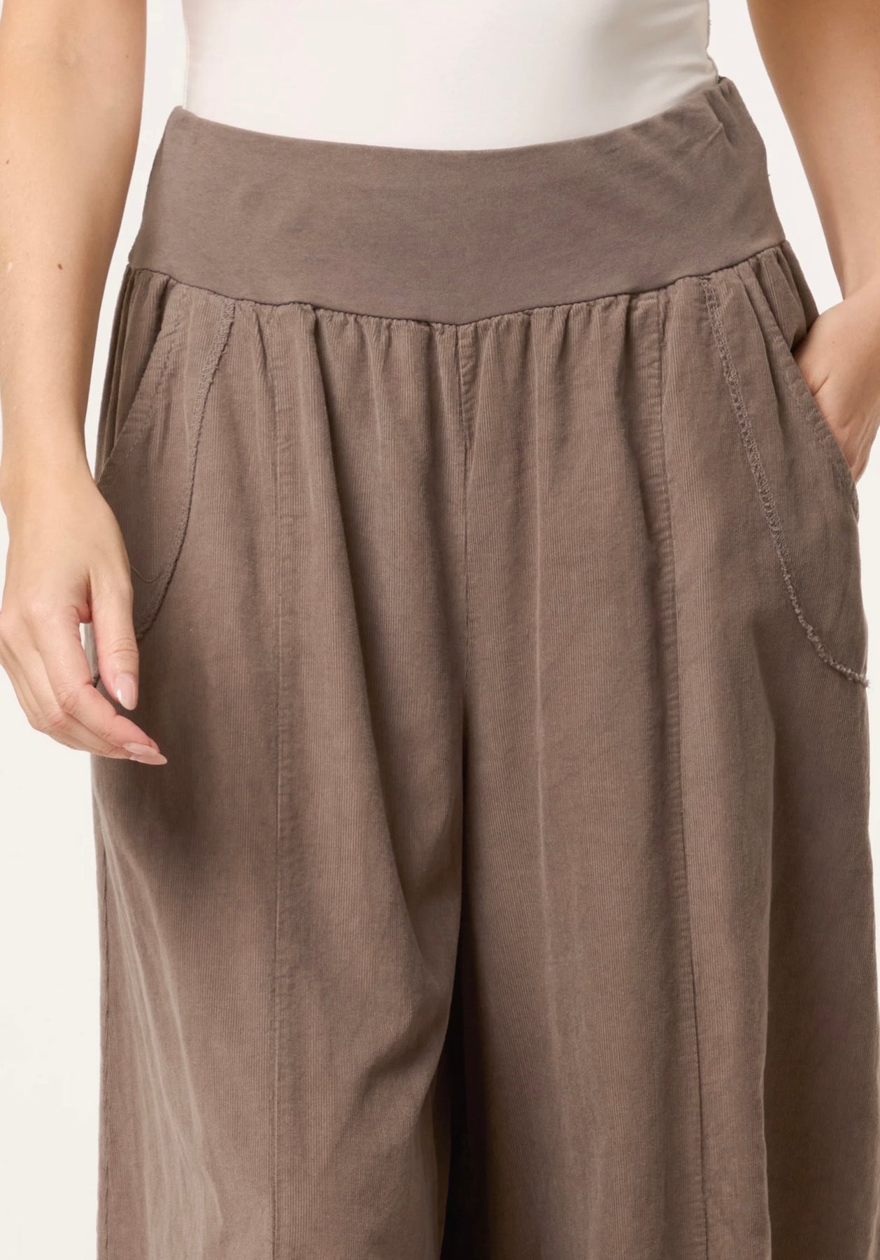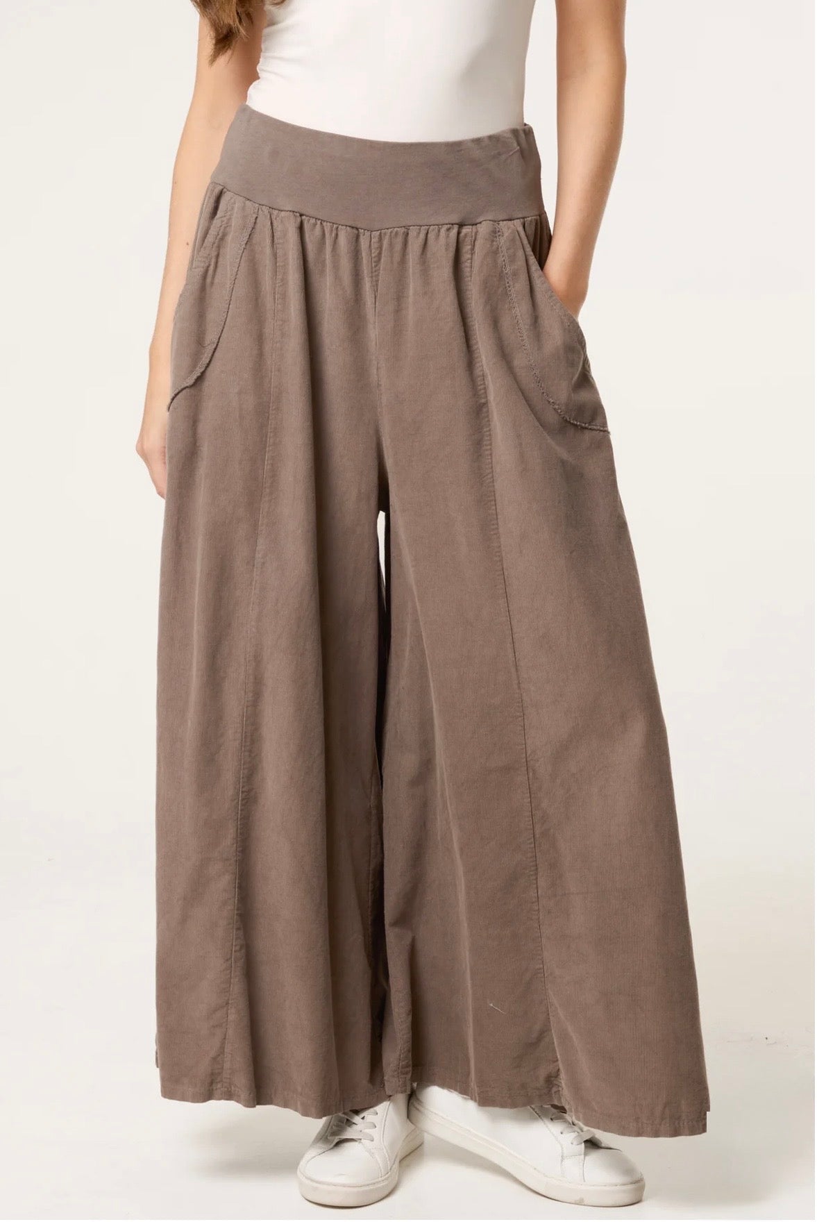 Effortless, timeless and beautifully refined, Velluto palazzo trousers are crafted from very soft corduroy for an elegant yet relaxed finish. Designed with a comfortable elasticated waistband, they sit smoothly on the waist while the wide palazzo leg creates a fluid, flattering silhouette that moves beautifully. The rich corduroy texture gives Velluto an instantly expensive-looking appeal, making them perfect for both everyday wear and elevated smart-casual styling. Finished with practical side pockets, these trousers combine comfort, versatility and Italian-inspired elegance in one timeless piece. Style with knitwear, soft shirts or simple tees — Velluto is the kind of wardrobe essential that works effortlessly across seasons.