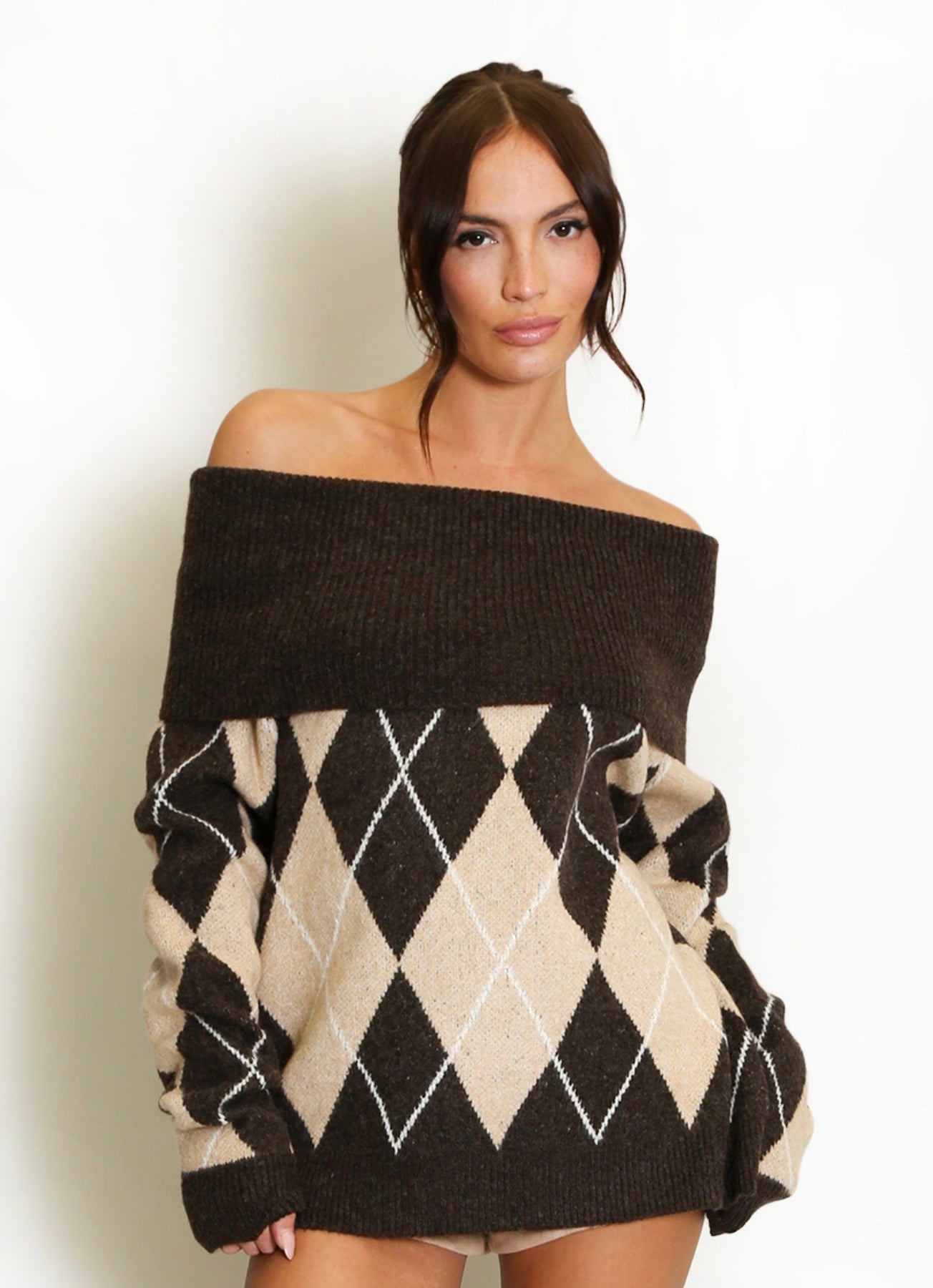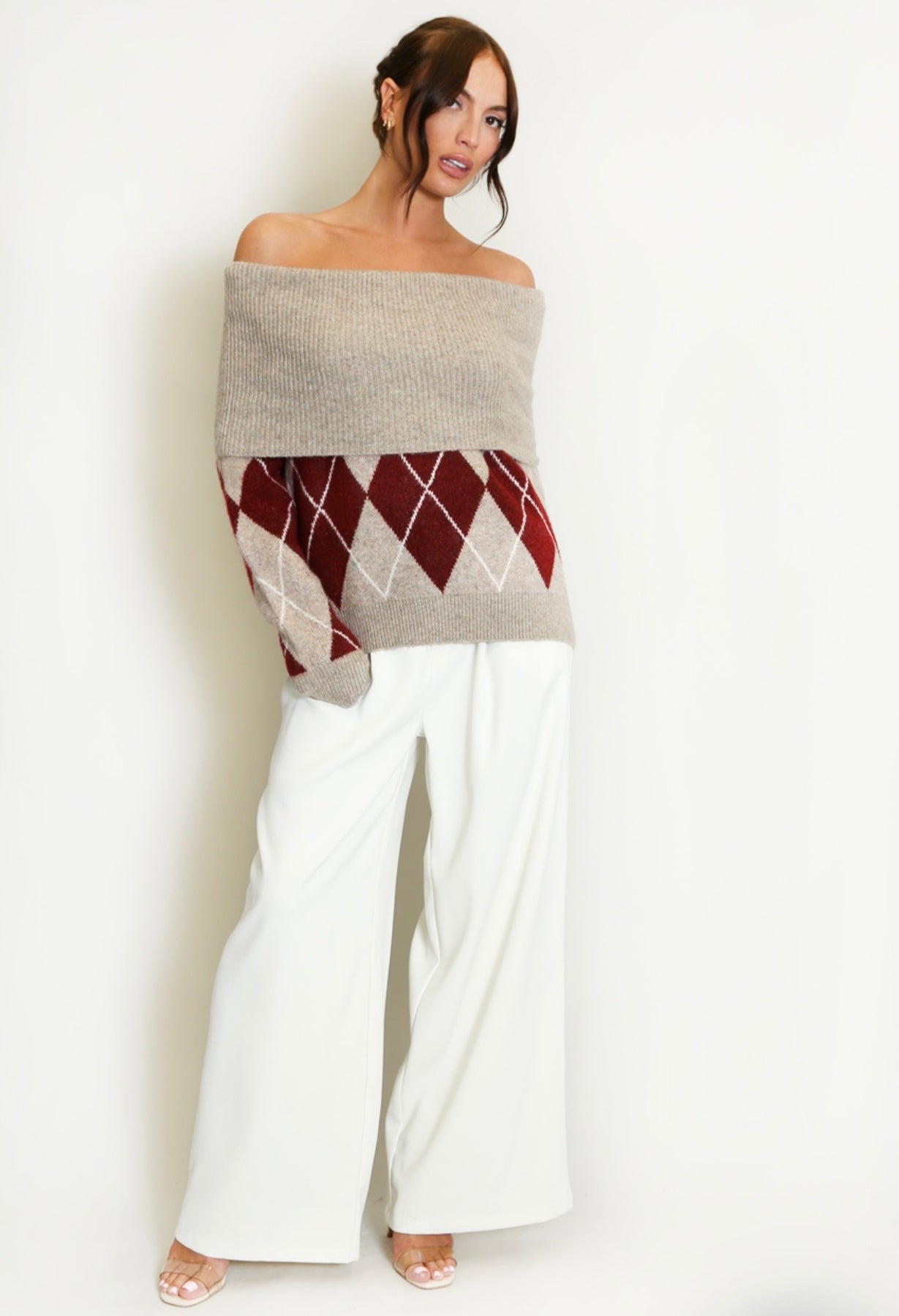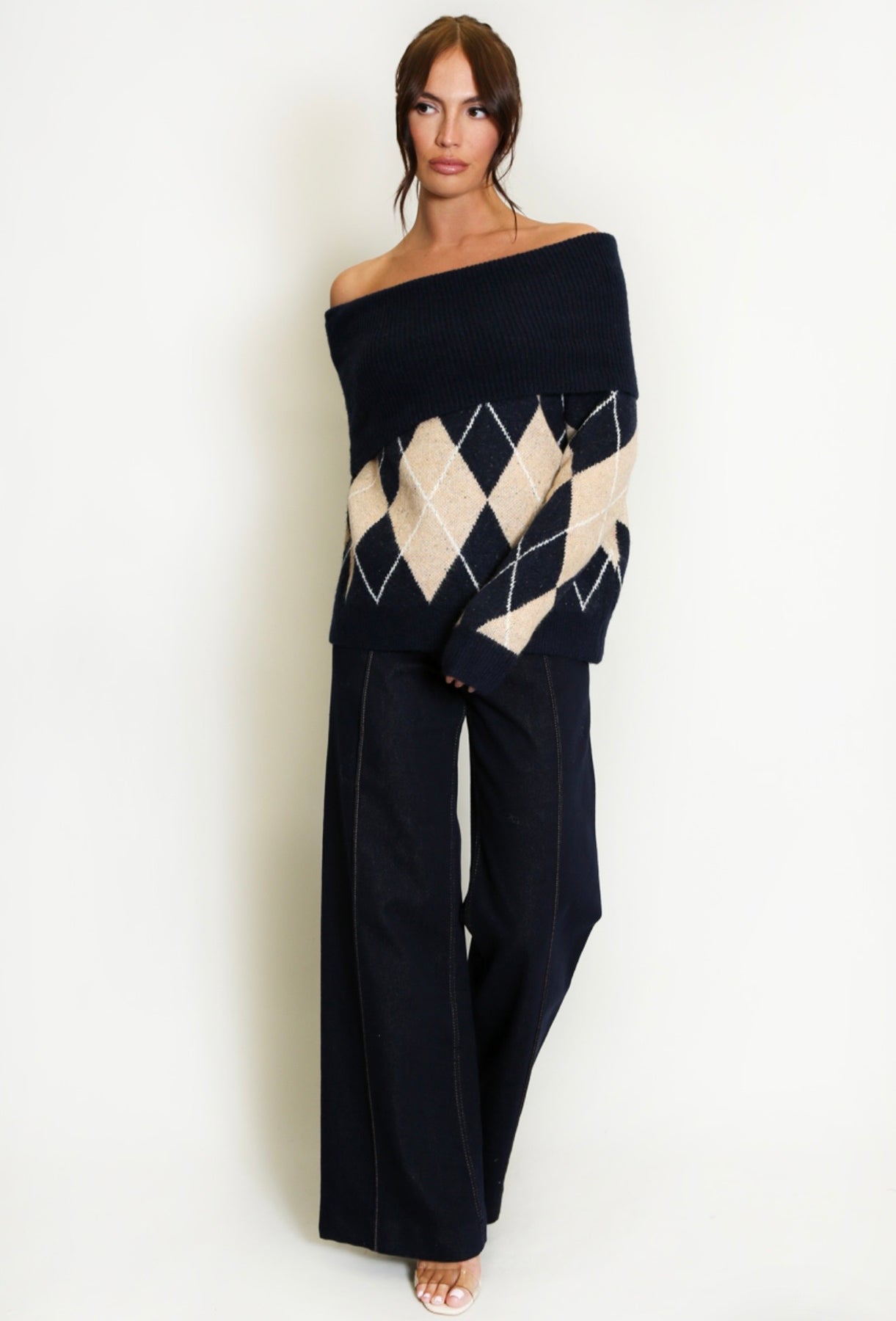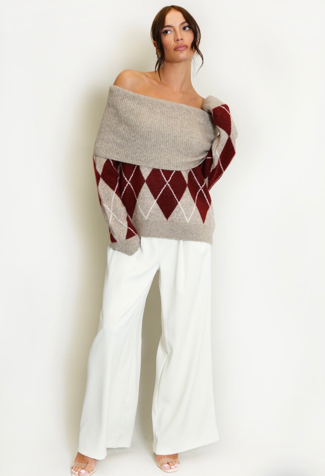 Scozia blends Italian elegance with the charm of classic Scottish heritage. Crafted in a warm and soft wool-blend knit, this beautiful jumper features the iconic Scottish-inspired argyle diamond pattern, reimagined in a modern, feminine way. The Bardot-style off-shoulder neckline sits gracefully across the collarbone for an elegant, flattering look — yet the design allows you to gently pull it slightly up the shoulders when you prefer a more relaxed, cosy feel. Long sleeves and a relaxed silhouette complete the look, making Scozia a timeless piece that transitions effortlessly from daytime comfort to evening chic. Pair it with Fleur jeans, Londra herringbone trousers or your favourite Aria skirt for a polished winter outfit rooted in heritage, softness and understated Italian charm.