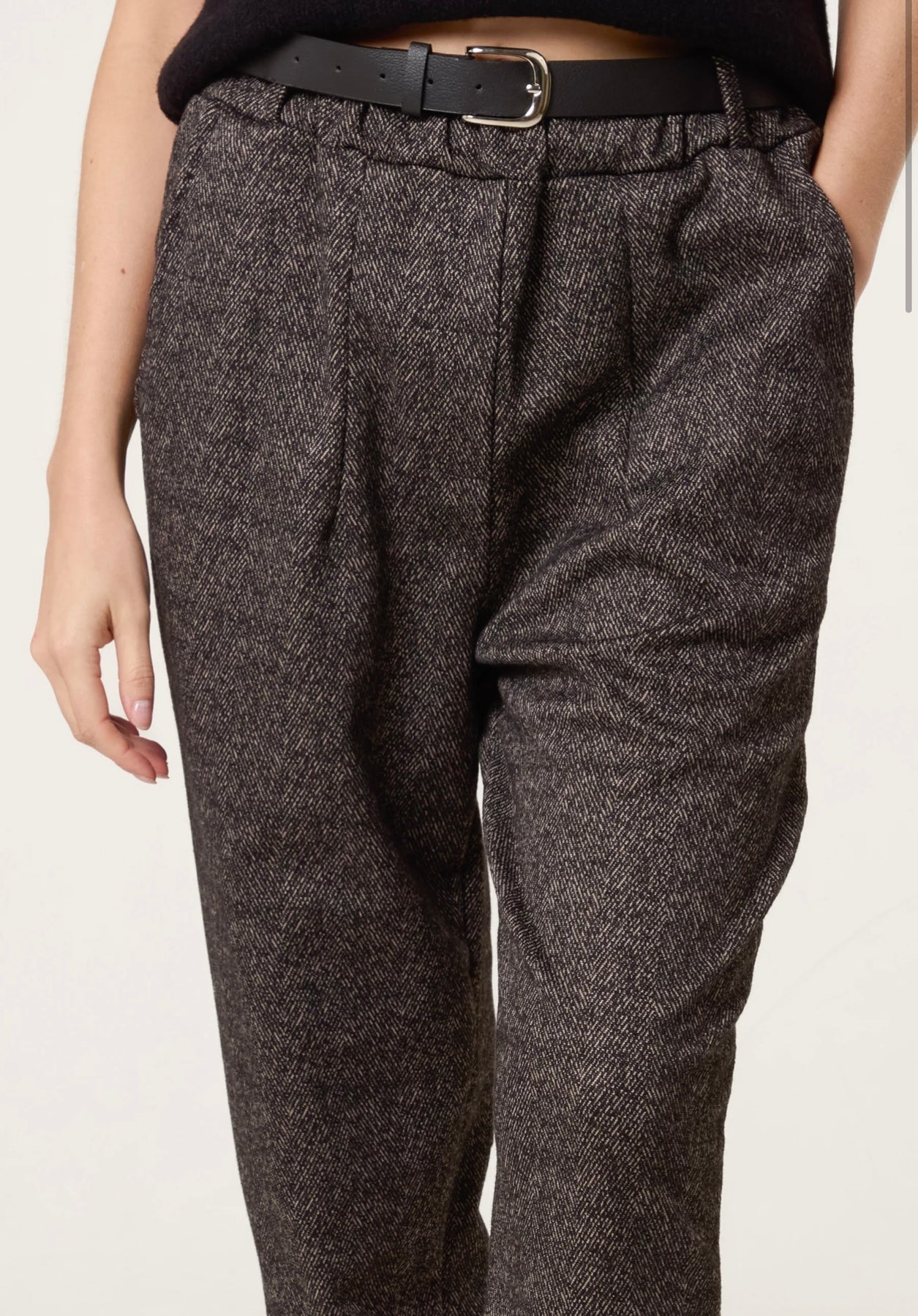 Close-up of Londra herringbone fabric and belt detail — elegant tailored trousers.