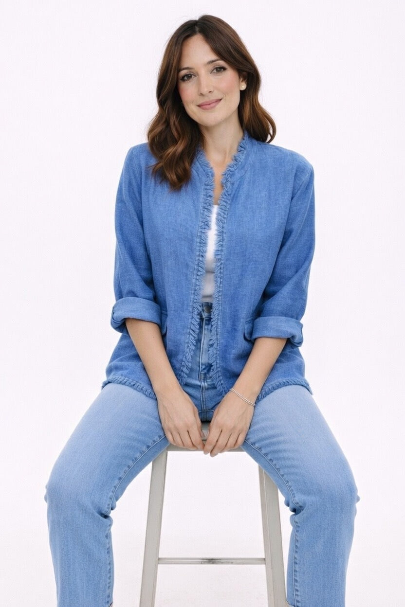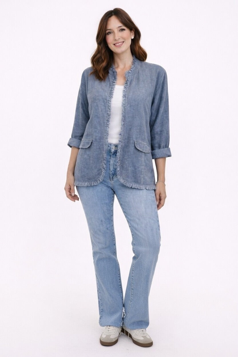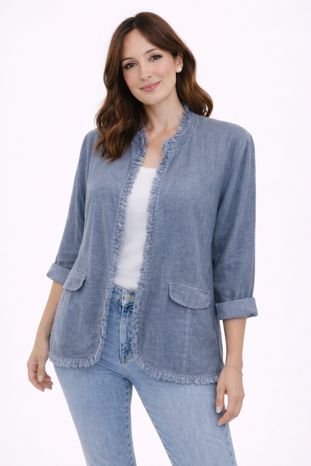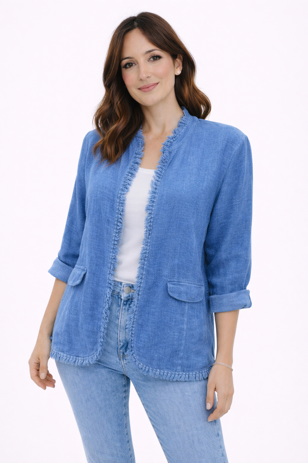 Smart casual women’s linen cotton blazer in denim blue -relaxed fit, frayed edge