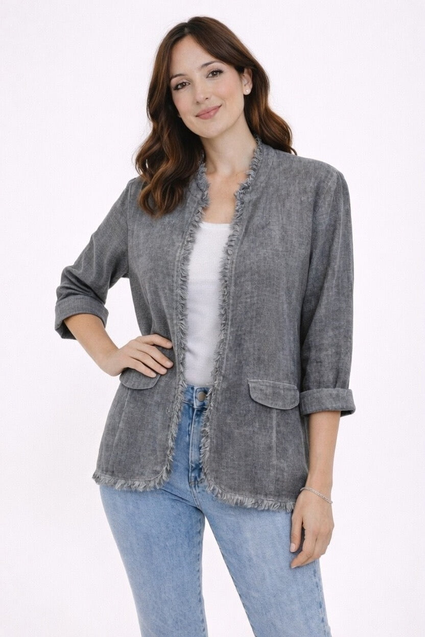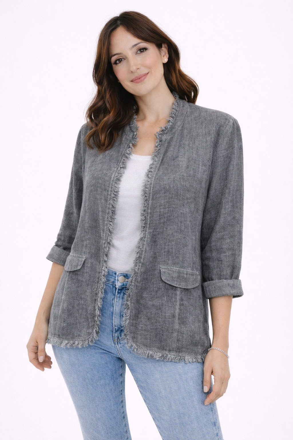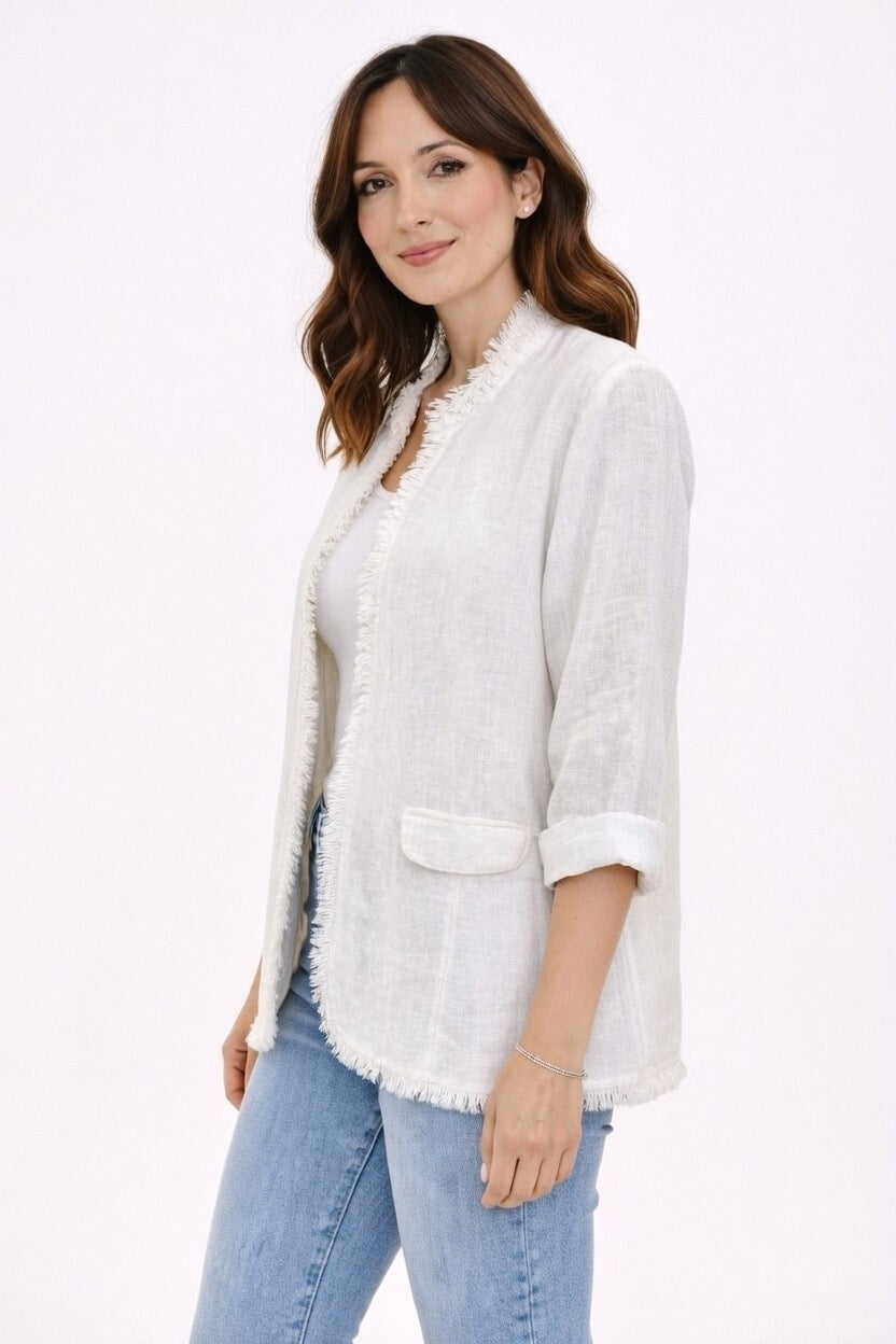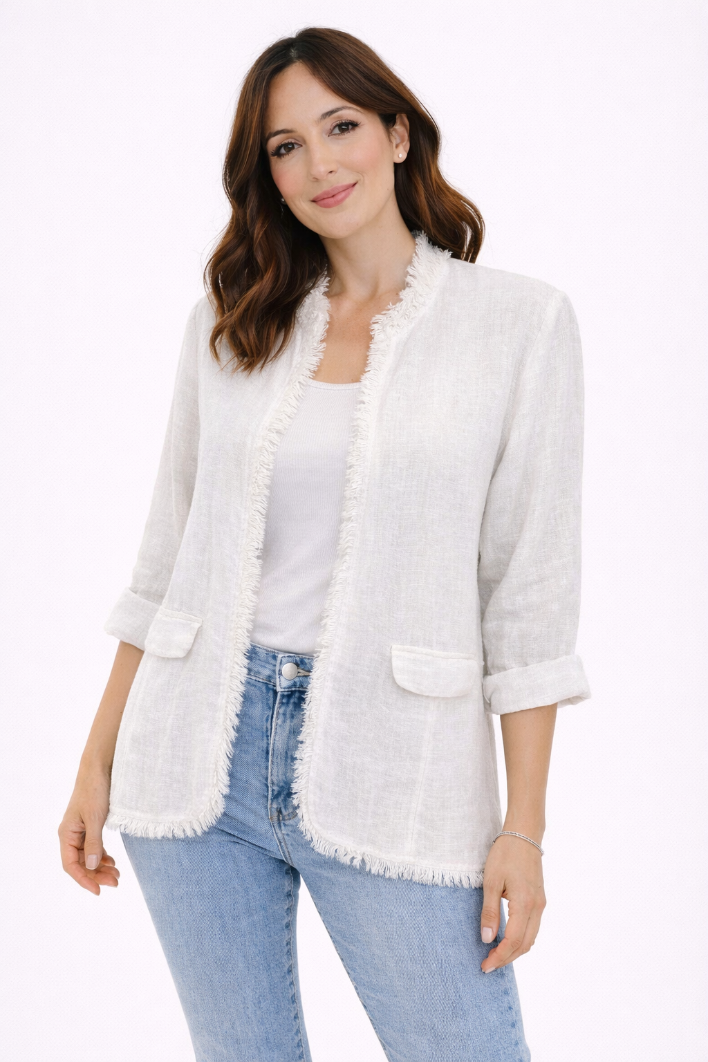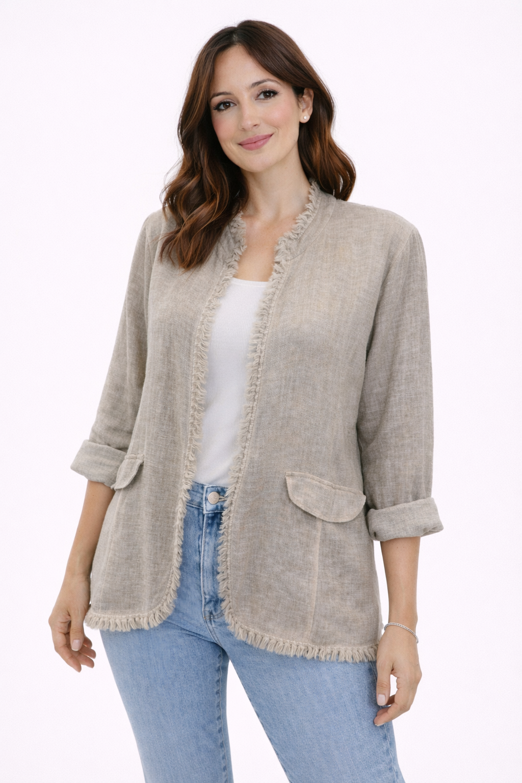 Elevate your everyday wardrobe with Sabbia, a smart-casual cotton and linen blend blazer that brings effortless sophistication to any outfit. Crafted from a breathable, natural fabric mix, this lightweight women’s blazer features a relaxed silhouette, rolled sleeves, soft frayed edges, and chic open-front styling. Designed as a one-size piece to fit sizes 8–16, Sabbia offers a flattering fit across a range of body shapes. Whether layered over a tee and jeans for a laid-back look, or styled with tailored trousers for workdays, it’s the versatile wardrobe staple you’ll wear on repeat. Available in a curated palette of neutral and denim-inspired shades, this linen-cotton jacket is the ultimate blend of comfort, texture, and timeless style.