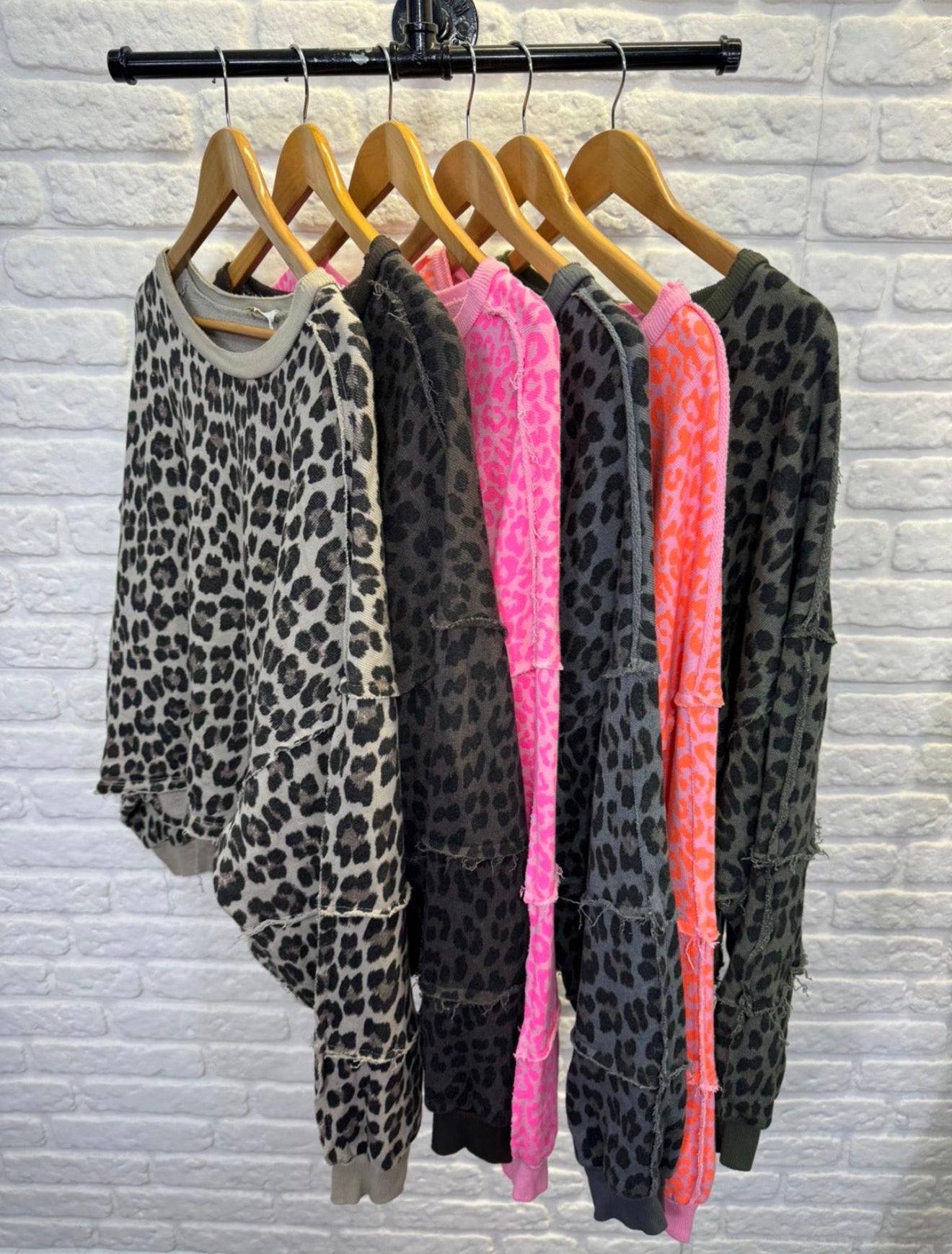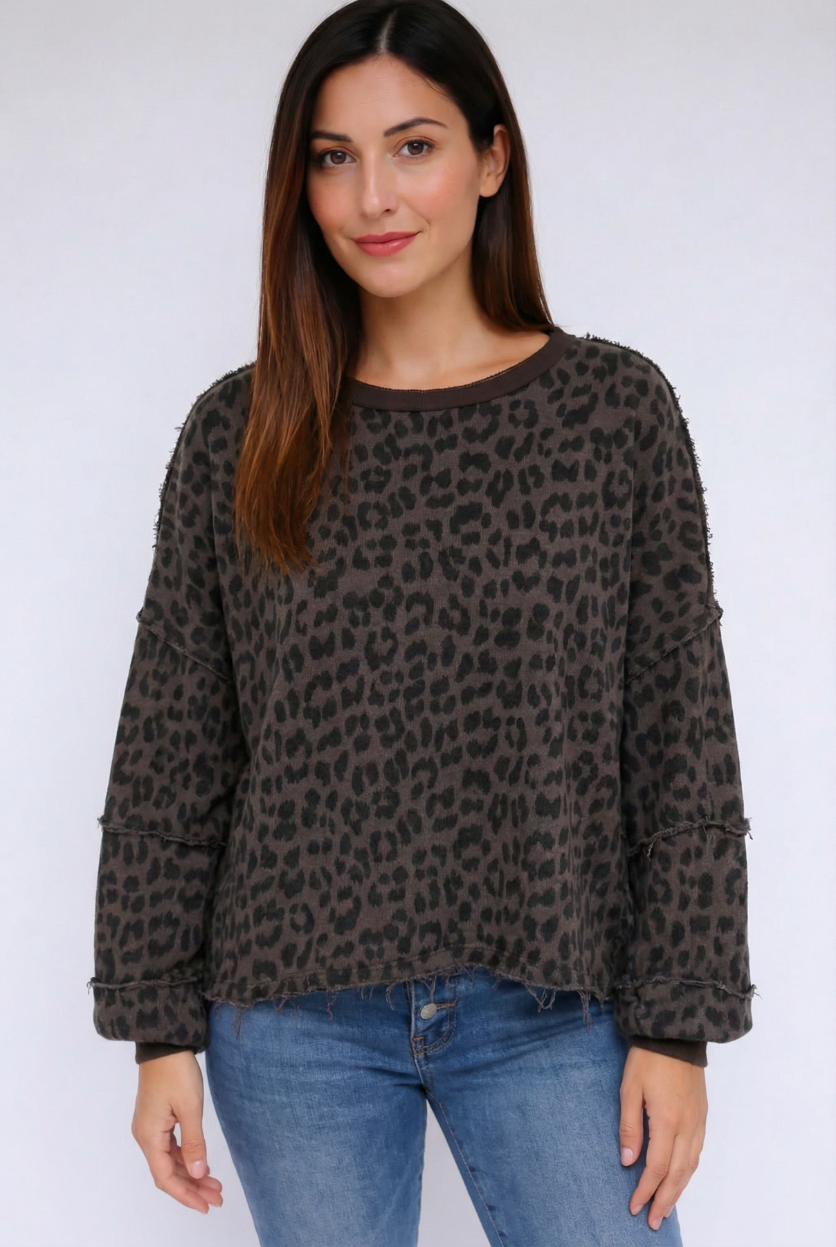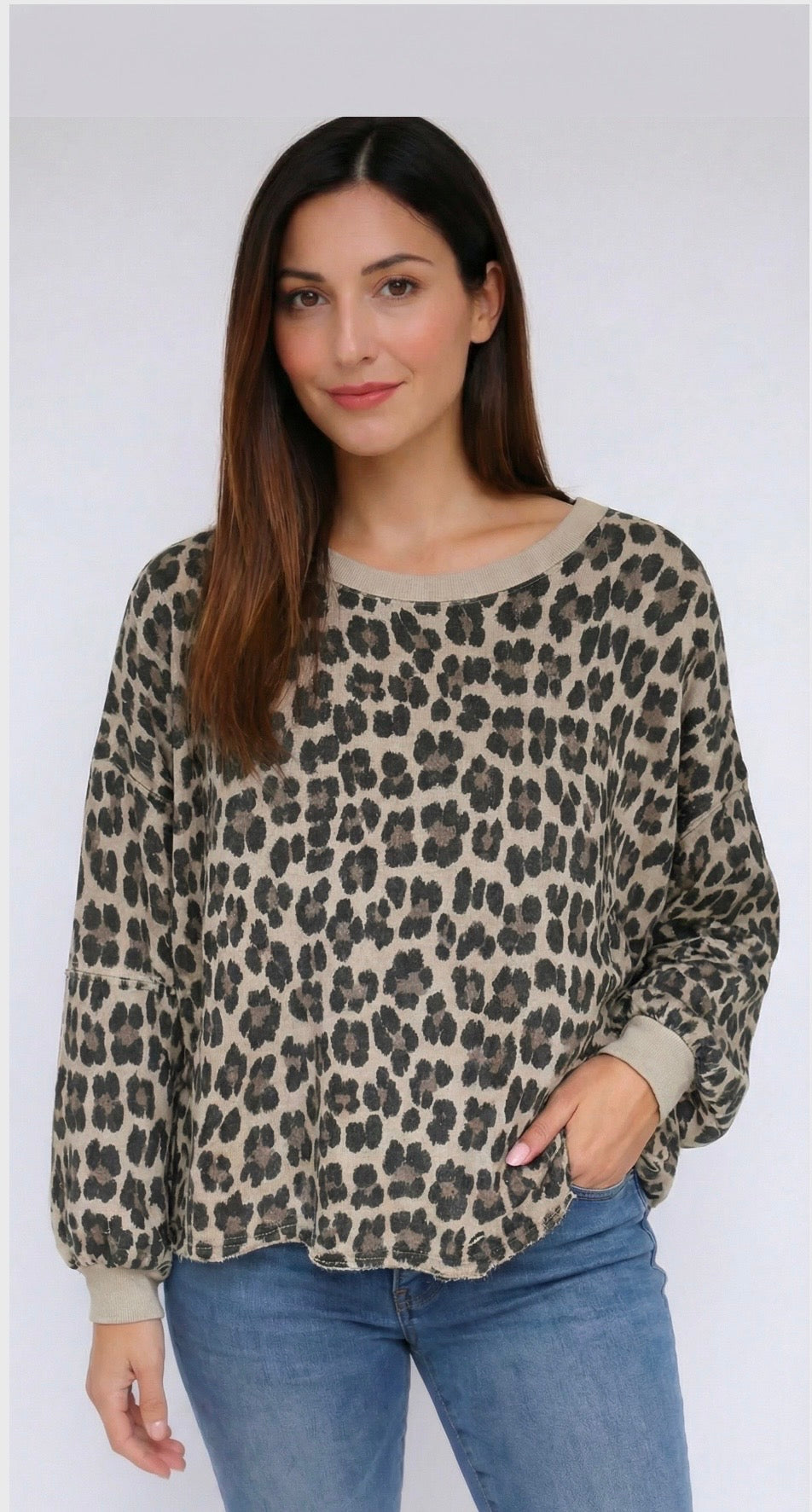 Ground your style this season with Terra, the autumnal sister to our best-selling Selvaggia. Crafted in Italy from the same soft cotton blend, this oversized sweatshirt features a chic leopard print in earthy tones — khaki green, mocha and rich chocolate. With its relaxed fit, raw hemline, and dropped shoulder detail, Terra is designed to bring effortless comfort with a touch of wild sophistication. Perfect for layering on crisp autumn walks, coffee catch-ups, or relaxed weekends, it’s a versatile piece that works season after season. Style it with your favourite Aria jeans - Melly & Co- Toxik3 Paris, or leather leggings to capture that easy autumn chic.