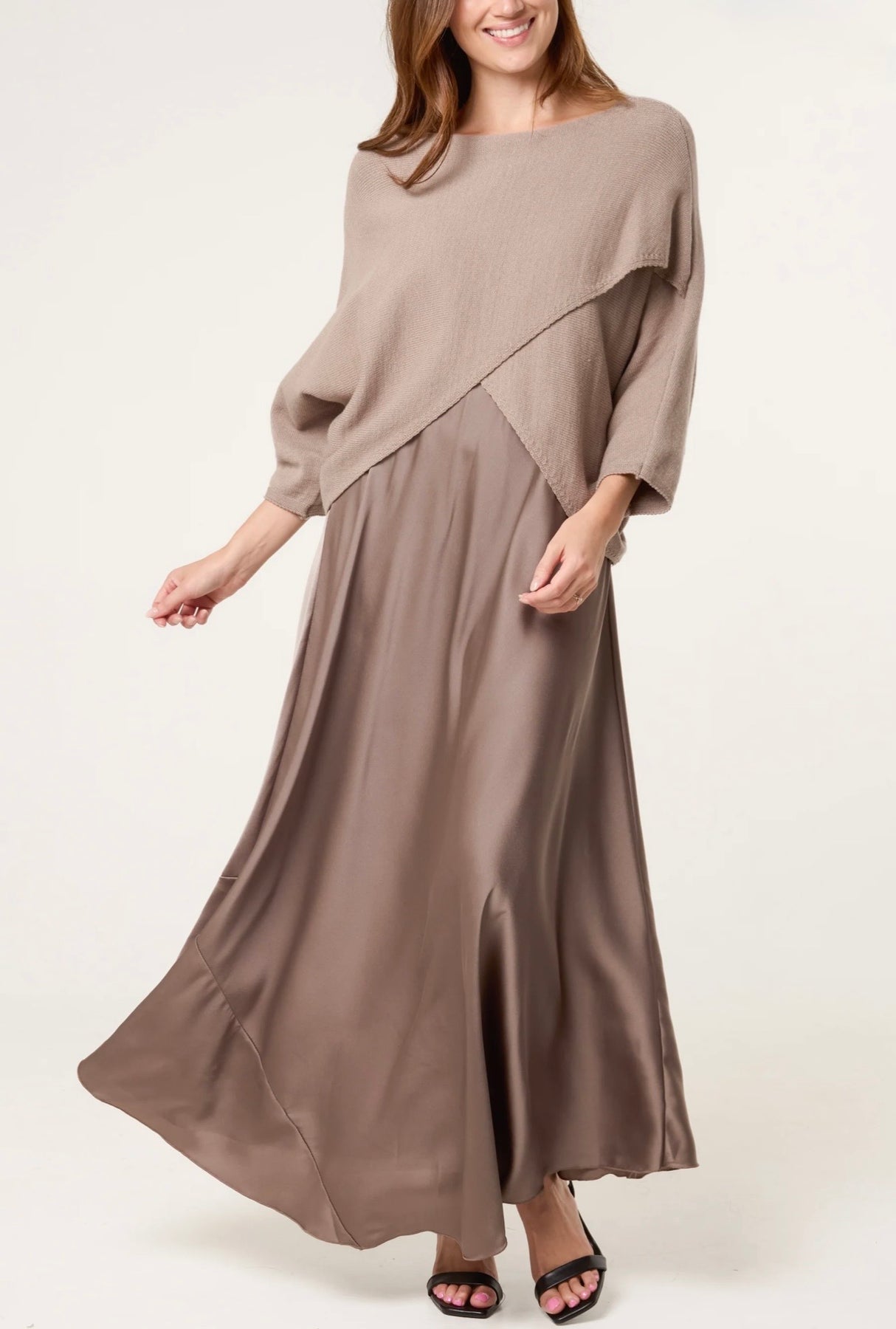 Meet Preziosa, your new statement set crafted for elegance, comfort, and effortless charm. This two-piece ensemble features a beautifully open-knit top paired with a luxurious satin slip dress, creating a look that is both refined and irresistibly feminine. The satin dress drapes softly along the body with a smooth, fluid silhouette that catches the light, while the open knit top adds texture, coverage, and sophistication, making the entire outfit perfect for day events, dinners, parties, or special occasions. Worn together, they create an elevated layered look — worn separately, they become two timeless wardrobe staples you’ll reach for again and again. Designed for comfort and versatility, Preziosa flatters all body shapes with its silky movement, lightweight feel, and chic, elegant lines. Whether styled with heels, boots or simple sandals, this set delivers instant glamour with zero effort.